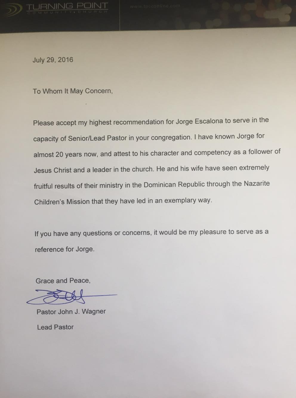 Reference letters from our pastor/church: